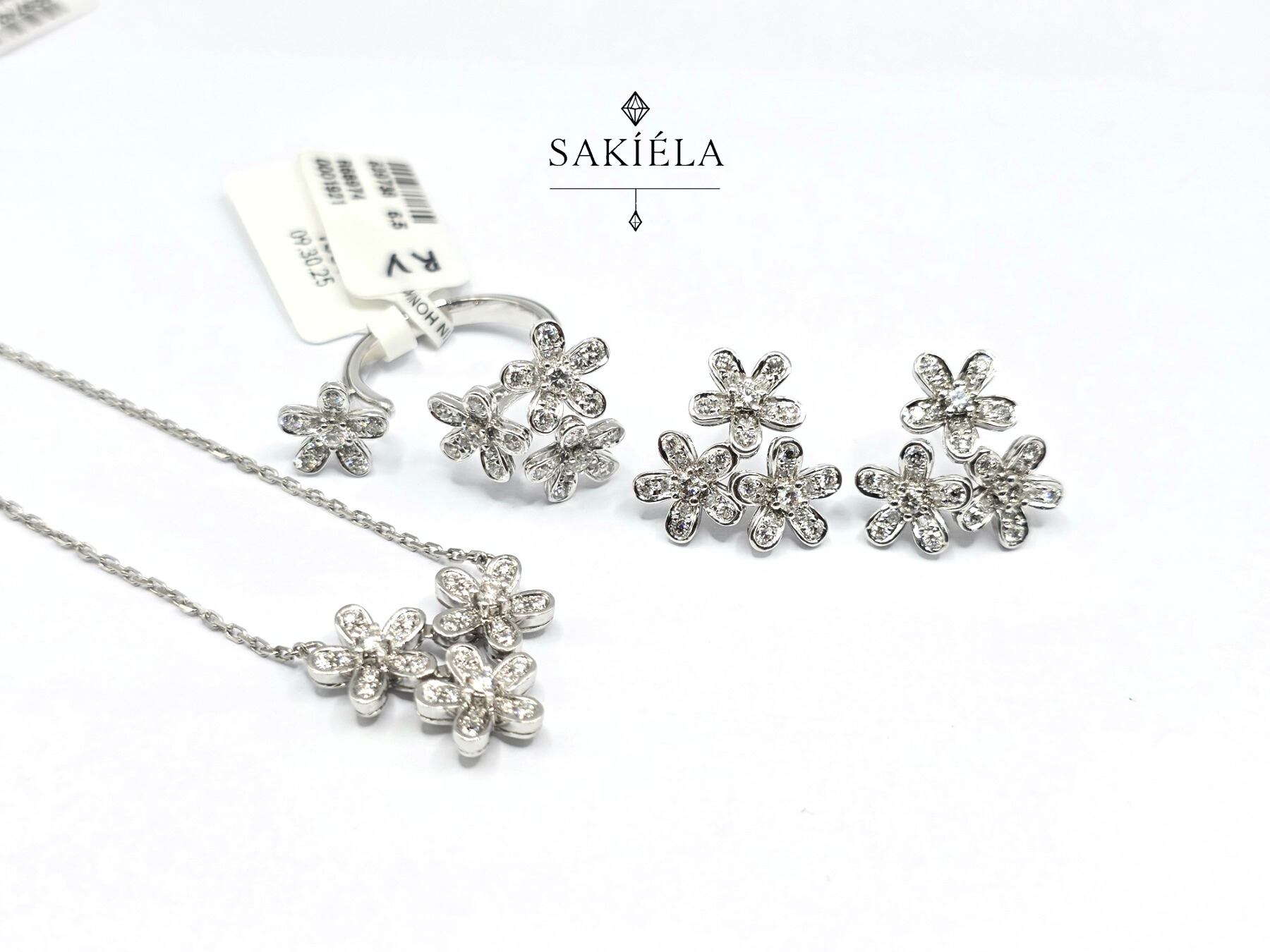 A radiant floral set that embodies elegance in every detail. 🌷✔️ 2.1cts Natural Diamonds✔️ VVS1 Clarity | Color H✔️ 19.85 grams | 18" Adjustable | Ring Size: 6½✔️ 18 Karat White Gold Mounting
