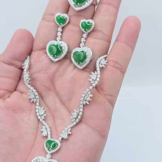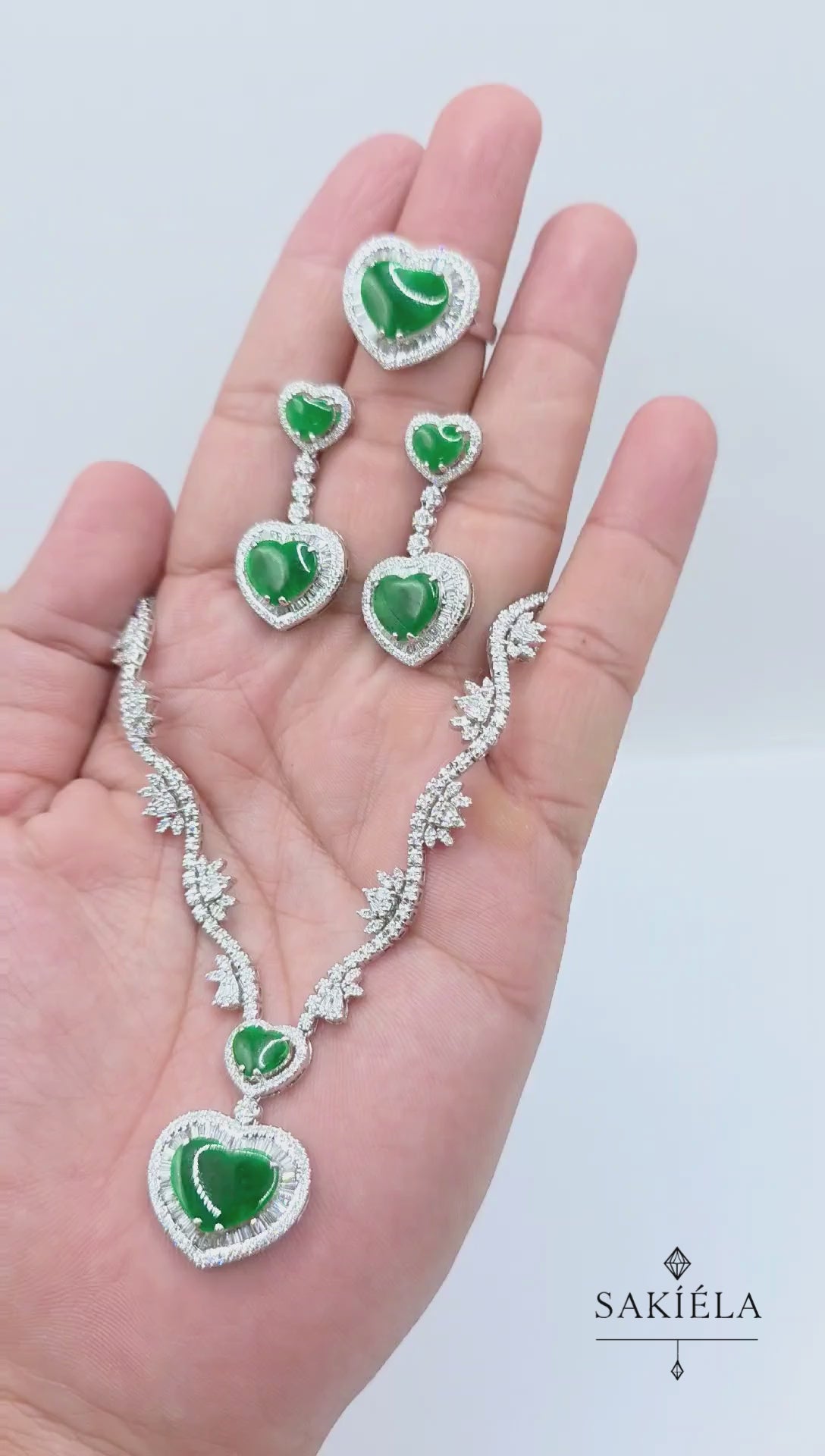 Hearts in jade, glowing with diamond fire 💚💎✨✔️ 3.24cts Natural Diamonds✔️ 7.06cts Jade✔️ VVS1 Clarity | H Color✔️ 14k White Gold (30.17g)✔️ Ring Size: 6½✔️ Necklace Length: 16"✔️ NEW ARRIVALS