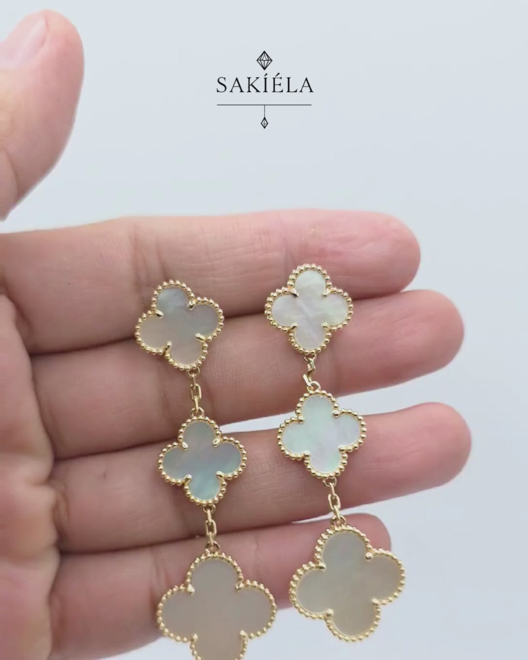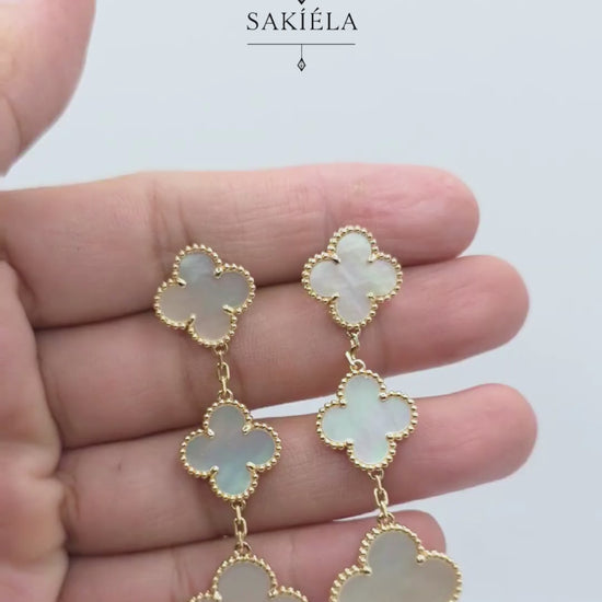 Radiate pure elegance with these triple motif mother-of-pearl earrings. 🌸✨ A symbol of grace and timeless luxury.✔️ Weight: 14.16 grams✔️ 14 Karat Gold
